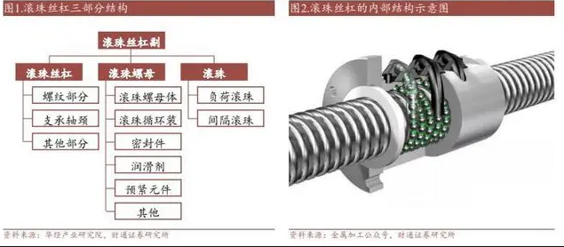 滾珠絲杠,又名滾珠絲杠副,是工業(yè)精密機(jī)械中常用的傳動(dòng)元件,其主要結(jié)構(gòu)包括滾珠絲杠、滾珠螺母、滾珠三部分。滾珠絲杠軸為螺母運(yùn)動(dòng)的導(dǎo)向軸,其表面具有螺紋,滾珠在螺紋內(nèi)運(yùn)動(dòng)。螺母由預(yù)壓片、反向器、防塵器等組成,是直線運(yùn)動(dòng)的移動(dòng)體,帶動(dòng)滾珠循環(huán)機(jī)制;其端部密封件用于封裝潤滑零件、防止異物進(jìn)入。滾珠是利用低摩擦系數(shù)維持整個(gè)零部件運(yùn)轉(zhuǎn)的媒介,存在外循環(huán)、內(nèi)循環(huán)兩種循環(huán)方式。