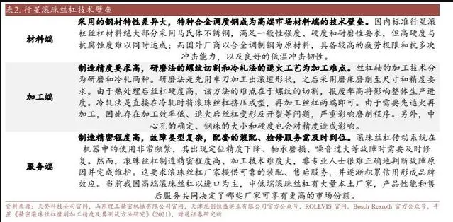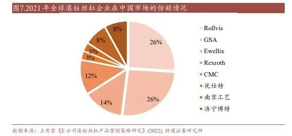 從我國滾動(dòng)功能部件的市場(chǎng)格局來看,日本、歐洲企業(yè)主導(dǎo)高端市場(chǎng),中國企業(yè)仍有進(jìn)步空間。根據(jù)金屬加工公眾號(hào)信息,在國內(nèi)滾動(dòng)功能部件的高端市場(chǎng),日本、歐洲企業(yè)合計(jì)市場(chǎng)份額高達(dá) 90%,中國大陸、中國臺(tái)灣企業(yè)市場(chǎng)份額各約5%,高端市場(chǎng)格局相對(duì)集中;在國內(nèi)滾動(dòng)功能部件的中低端市場(chǎng),中國大陸廠商的市場(chǎng)份額約 30%。根據(jù)王有雪論文《E 公司滾柱絲杠產(chǎn)品營銷策略研究》論述,2021 年我國行星滾柱絲杠市場(chǎng)供應(yīng)量排名前四的廠家分別是 Rollvis(瑞士)、GSA(瑞士)、Ewellix(瑞典)Rexroth(德國),市占率分別為 26%、26%、14%,12%。對(duì)于行星滾柱絲杠,由于市場(chǎng)較小,行業(yè)參與者主要以海外企業(yè)為主,主要包括斯凱孚、GSA、伊維萊(Ewellix)、博世力士樂等。