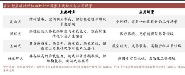 行星滾柱絲杠在標(biāo)準(zhǔn)式基礎(chǔ)上衍生出四種類型,它們?cè)诮Y(jié)構(gòu)和功能上具有不同的特點(diǎn),從而適用于不同的應(yīng)用場(chǎng)景。