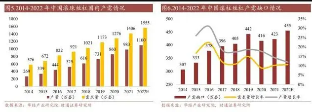 近年來國內(nèi)滾珠絲杠下游需求穩(wěn)步增長,產(chǎn)能端加速釋放。根據(jù)華經(jīng)產(chǎn)業(yè)研究院數(shù)據(jù),我國滾珠絲杠產(chǎn)需量缺口在 2014 年至 2021 年間由 307 萬套上升至 423萬套,預(yù)估 2022 年產(chǎn)需缺口為 455 萬套。2014 年至 2021 年產(chǎn)需缺口年均復(fù)合增長率約為 4.69%。當(dāng)前國內(nèi)滾珠絲杠產(chǎn)量增長速度逐漸趨于放緩,由高速增長逐步轉(zhuǎn)型為中低速增長,需求量繼續(xù)保持增長。未來隨我國高端裝備制造業(yè)不斷發(fā)展,相關(guān)設(shè)備的精密傳動(dòng)需求將不斷加大,對(duì)于滾珠絲杠大規(guī)模量產(chǎn)能力的要求將進(jìn)一步提高,或繼續(xù)刺激產(chǎn)能釋放。