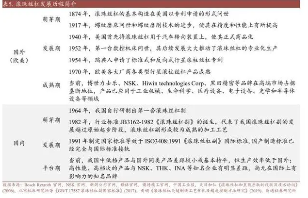 國內(nèi)外滾珠絲杠發(fā)展階段迥異,國內(nèi)滾珠絲杠生產(chǎn)技術(shù)正逐步向國外追趕。滾珠絲杠在國外起步早、發(fā)展快、技術(shù)成熟,歐美市場(chǎng)在高端滾珠絲杠制造領(lǐng)域占據(jù)壟斷地位,并且廣泛應(yīng)用到各領(lǐng)域;在國內(nèi)發(fā)展迅速,市場(chǎng)規(guī)模快速增長,同時(shí)國內(nèi)大型生產(chǎn)企業(yè)技術(shù)逐漸提升,有望逐步實(shí)現(xiàn)國產(chǎn)替代。